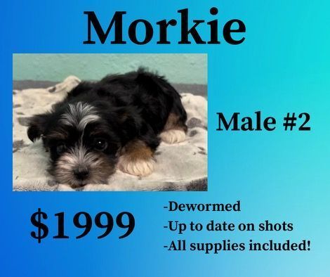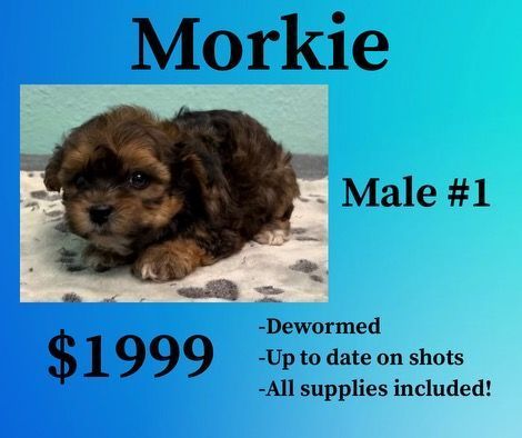 2 females and 1 male. (2 of them look nearly identical)! Mom is a Maltese and dad is a Toy Yorkie. Gorgeous, super playful, hypoallergenic, and non-shedding! Morkies are our most popular “designer” breed, and for good reason! Perfect size, great temperments, and intelligent family dogs. They’ve had their first round of booster shots and have been dewormed. Only $1999 each! Also included in the price are all of the supplies: Nutrisource puppy food, a leash, collar, food/water bowl, a brush, multiple toys, shampoo, potty training pads, and training treats. Feel free to stop by the store or give us a call during business hours if you are interested or have any questions, or would like to see/interact with them in the puppy play area.