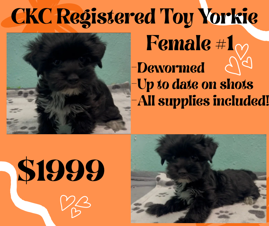 UPDATE: FEMALE #2 SOLD! These are very cute, unique Yorkies. The puppies are primarily black with some white markings on their chest and paws, but will end up either gold or silver like the parents! (Parents also pictured below). These are the most playful puppies in the store right now. And female #2 is super small. Both have really cute faces, but it’s difficult to see in the pics because they’re black. I’ll post a video tomorrow. Anyway, Yorkies are a hypoallergenic, non-shedding, extremely intellegent, playful, and quirky breed. My Yorkie, Buddy, is such a blessing! Anyway, along with the CKC papers, they've had their first round of shots and have been dewormed. Only $1999 each! Also included in the price are all of the supplies: Nutrisource puppy food, a leash, collar, food/water bowl, multiple toys, shampoo, a brush, training treats, and potty training pads. These won’t be here long. Feel free to stop by or give us a call if you have any questions, or would like to see them in person.