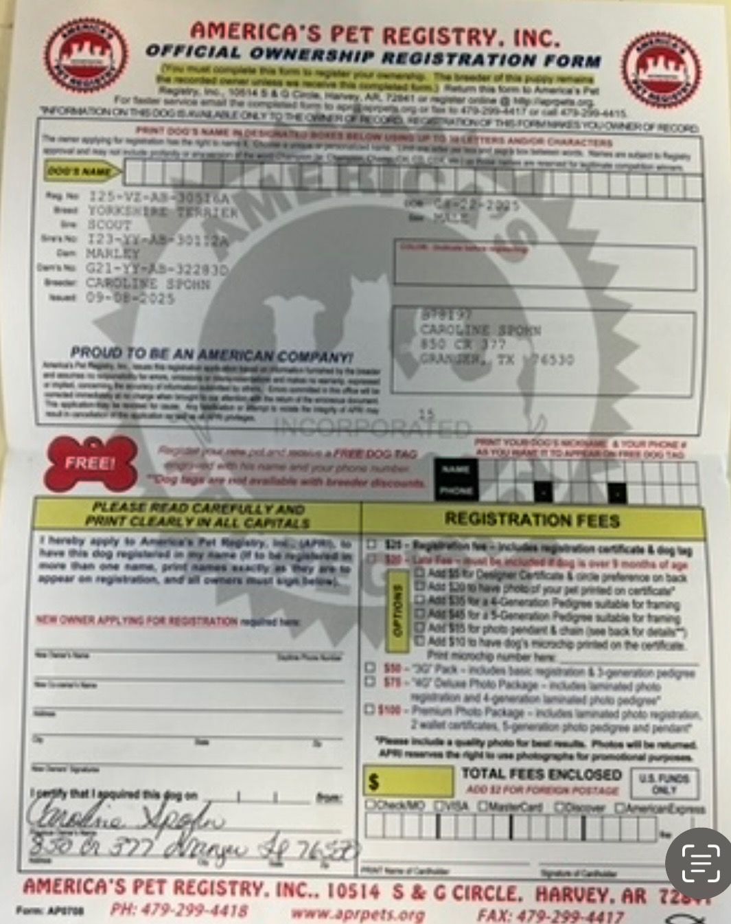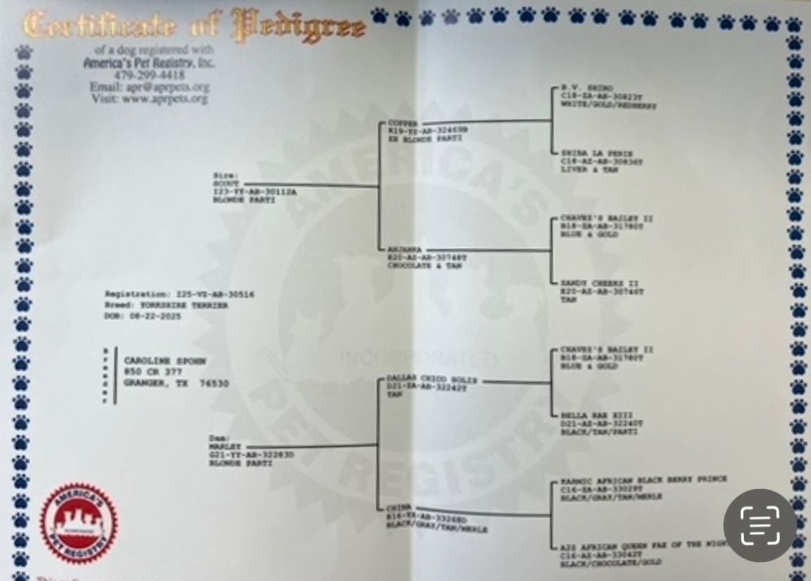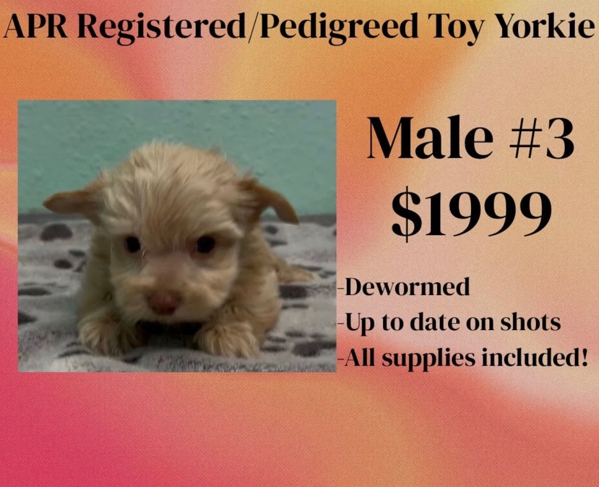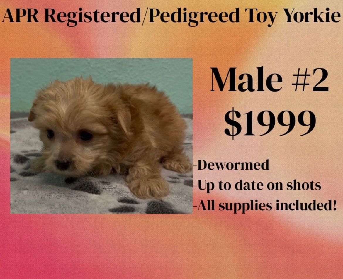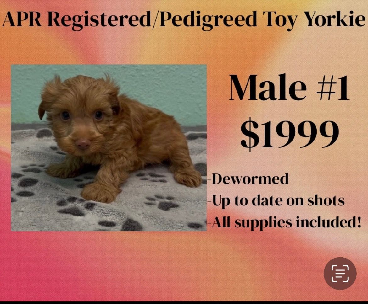 UPDATE: Only One Little Boy Remaining (Pictured Below) They also come with pedigrees aka lineage papers. These are exceptionally pretty and unique Yorkies. The parents are also beautiful (pictured below). Yorkies are a hypoallergenic, non-shedding, extremely intelligent, playful, and quirky breed. My Yorkie, Buddy, is such a blessing! Anyway, along with the APR papers and pedigrees, they've had their first round of shots and have been dewormed. Only $1999 each! Also included are all of the supplies: Nutrisource puppy food, a leash, collar, food/water bowl, multiple toys, a brush, shampoo, potty training pads, and training treats! These won't be here long! Feel free to stop by or give us a call during business hours if you're interested.