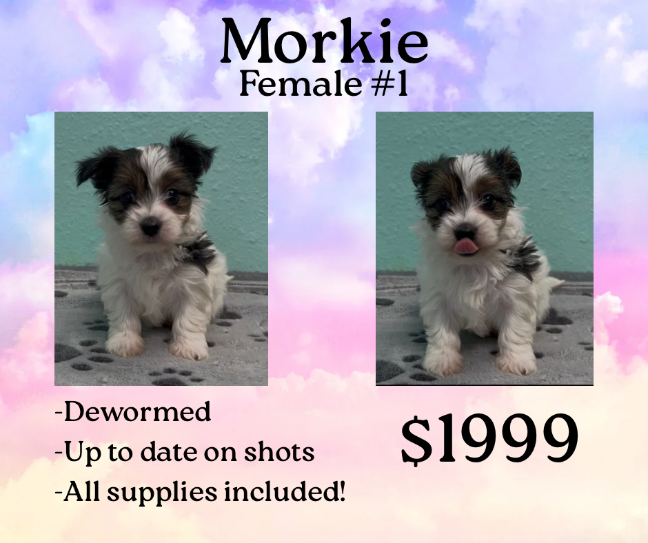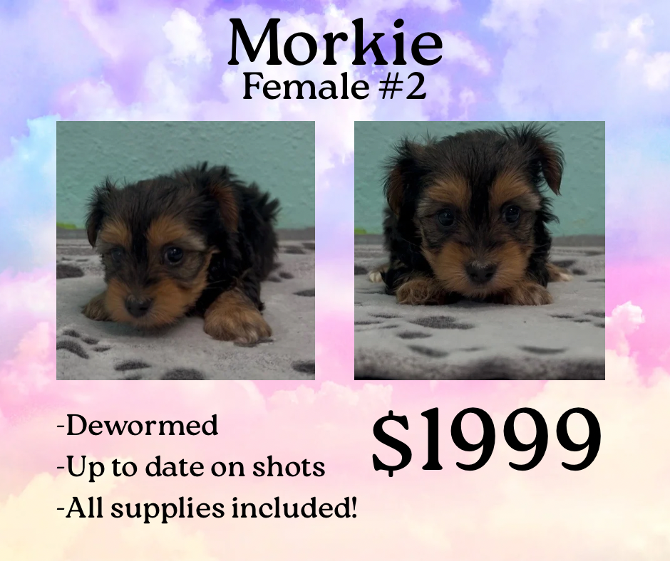 The two remaining Morkies are adorable. The girl looks like a purebred Yorkie. The boy is a tricolored pup. Both cute lil’ puppies!!