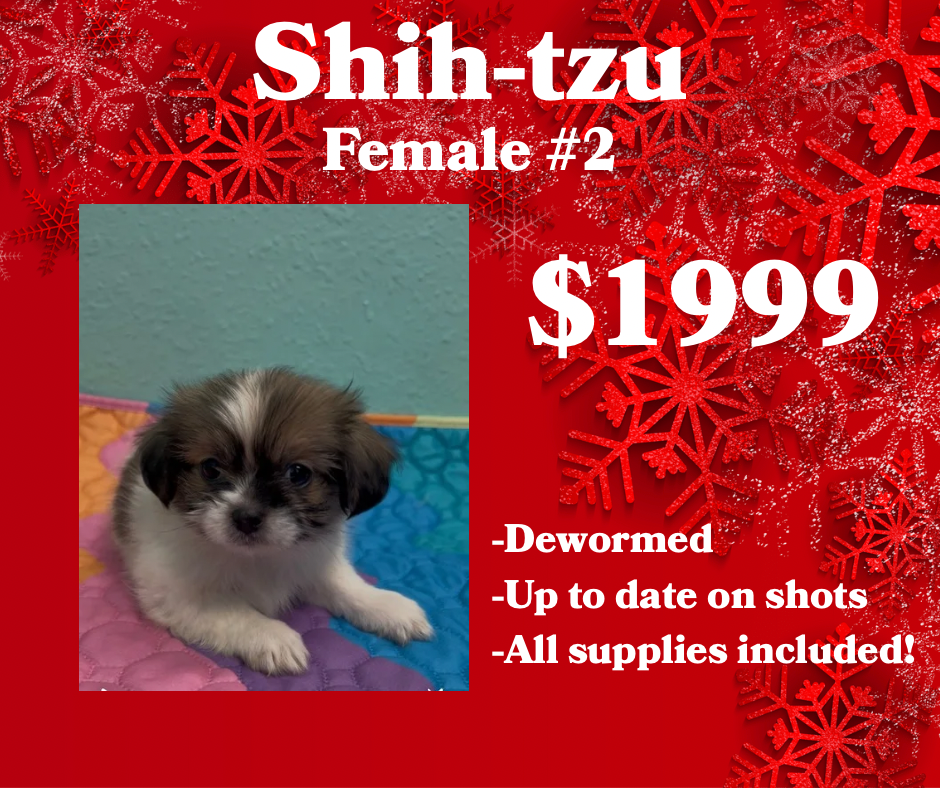 2 females and 1 male. Hypoallergenic and non-shedding family dogs. Shih-tzus are known to be the calmest and quietest of all of the non-shedding/hypoallergenic breeds! They’ve had their first round of booster shots and have been dewormed. $1999 each. Also included in the price are all of the supplies: Nutrisource puppy food, a leash, collar, food/water bowl, a brush, multiple toys, shampoo, potty training pads, and training treats. Feel free to stop by the store or give us a call during business hours if you are interested or have any questions, or would like to see/interact with them in the puppy play area.