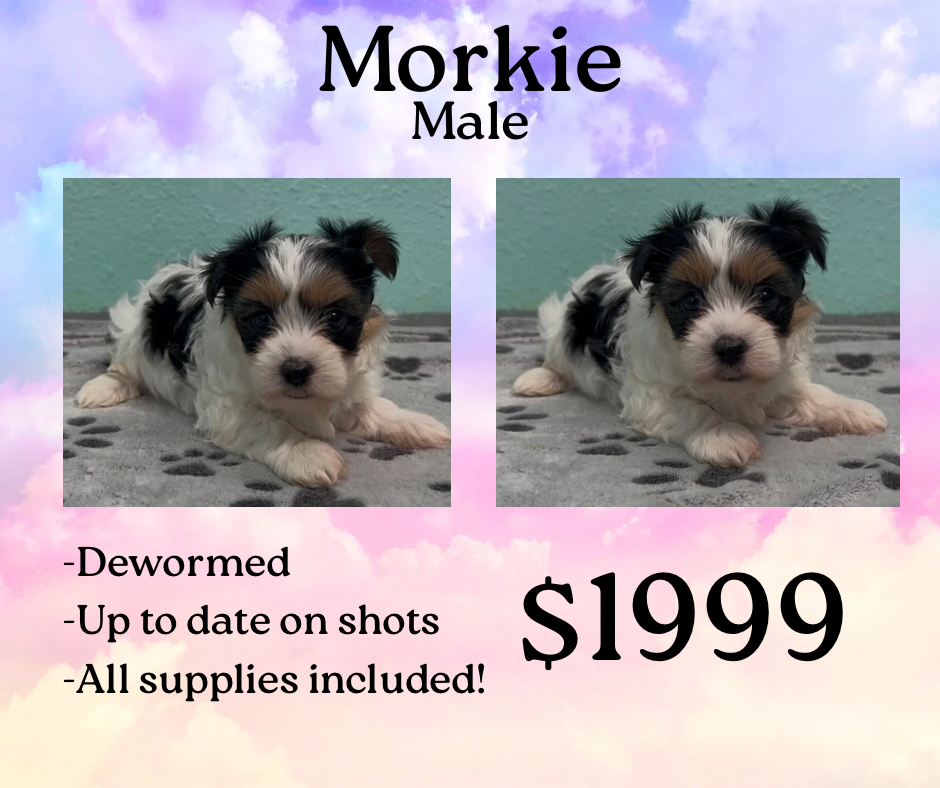 2 females and 1 male. (2 of them look nearly identical)! Mom is a Maltese and dad is a Toy Yorkie. Gorgeous, super playful, hypoallergenic, and non-shedding! Morkies are our most popular “designer” breed, and for good reason! Perfect size, great temperments, and intelligent family dogs. They’ve had their first round of booster shots and have been dewormed. Only $1999 each! Also included in the price are all of the supplies: Nutrisource puppy food, a leash, collar, food/water bowl, a brush, multiple toys, shampoo, potty training pads, and training treats. Feel free to stop by the store or give us a call during business hours if you are interested or have any questions, or would like to see/interact with them in the puppy play area.