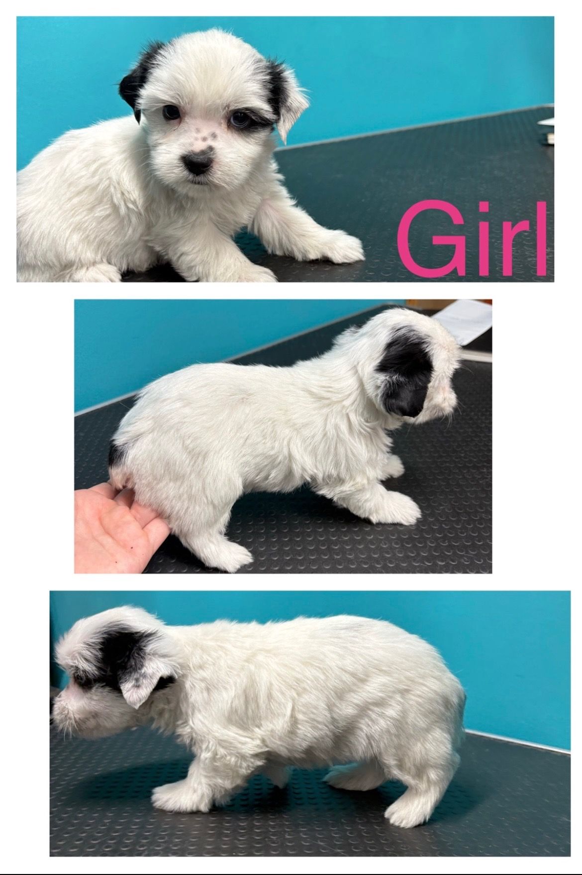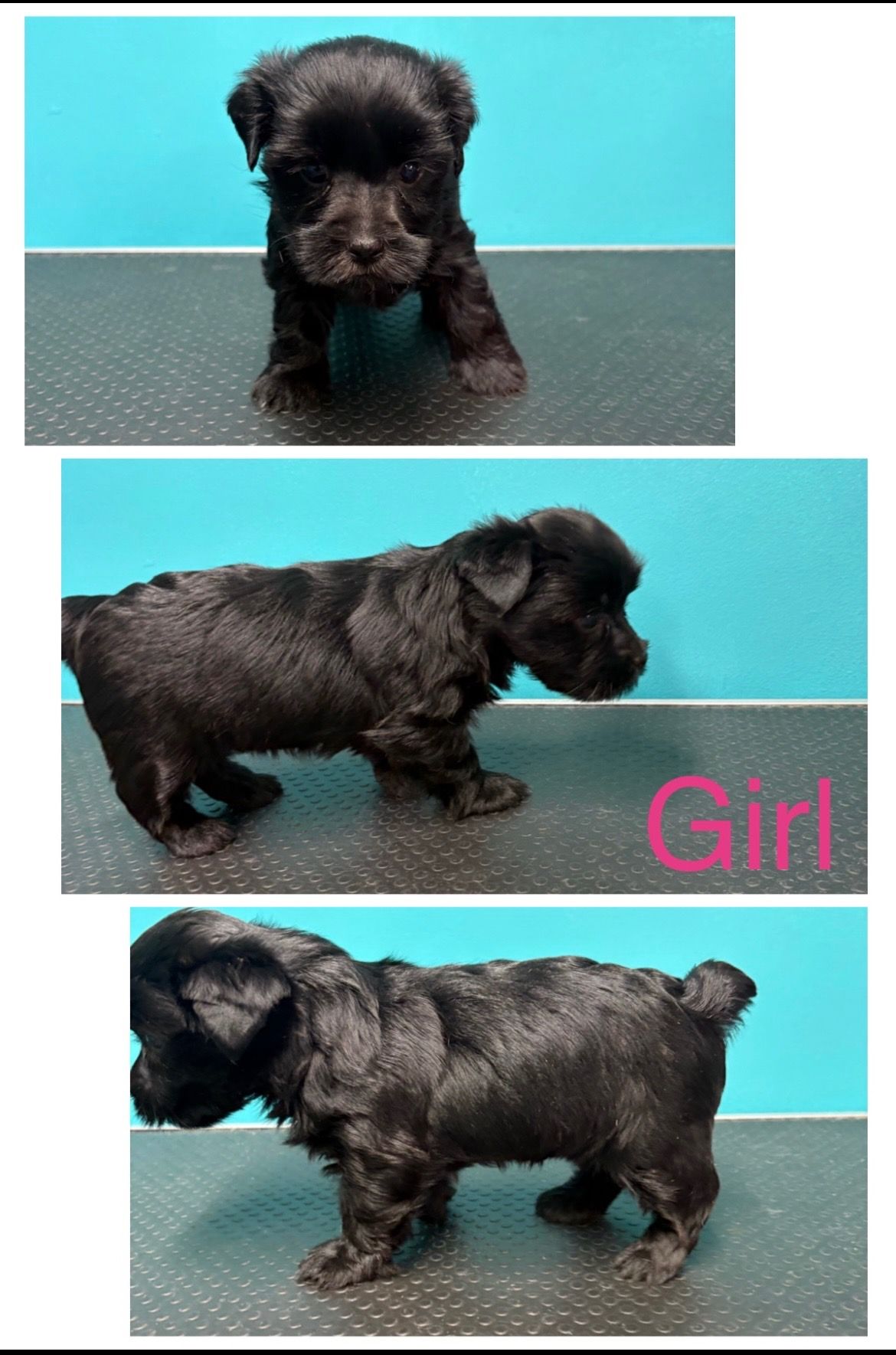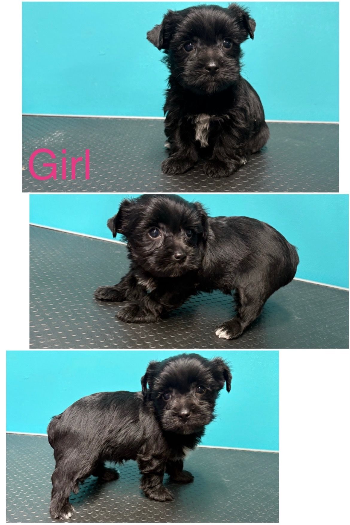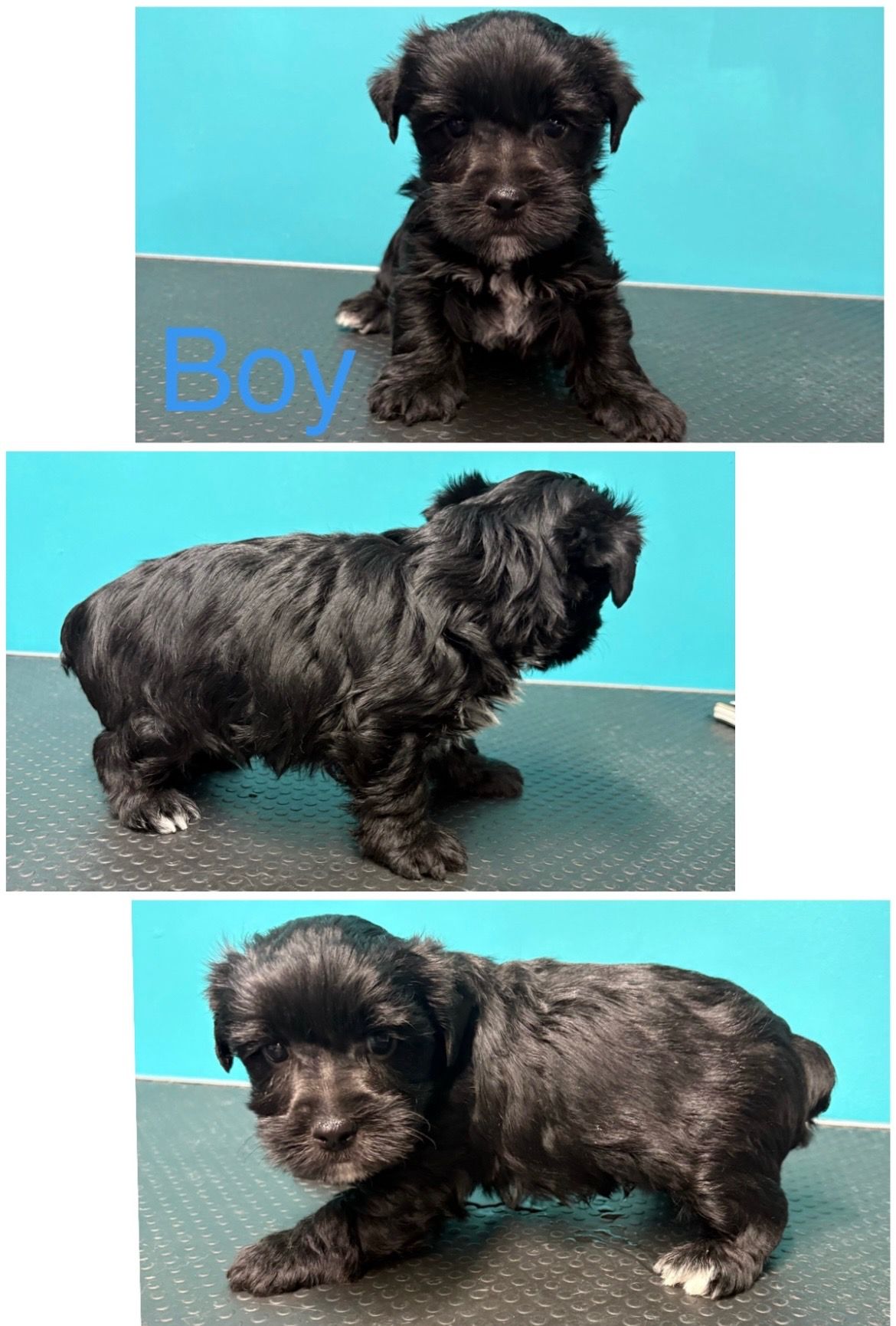 3 females and 1 male. They’re going to stay small like their parents (pictured below). Mom is silver and dad is traditional. 3 of the puppies start off black, but that changes quickly. There’s one “Parti” female that should keep the same coloration into adulthood. These are beautiful, super healthy, small, shiny-coated puppies that have had their first round of booster shots and have been dewormed. They’re only $1999 each. Also included in the price are all of the supplies: Nutrisource puppy food, a leash, collar, food/water bowl, multiple toys, shampoo/conditioner, training treats, and potty training pads! Feel free to stop by, or give us during business hours!